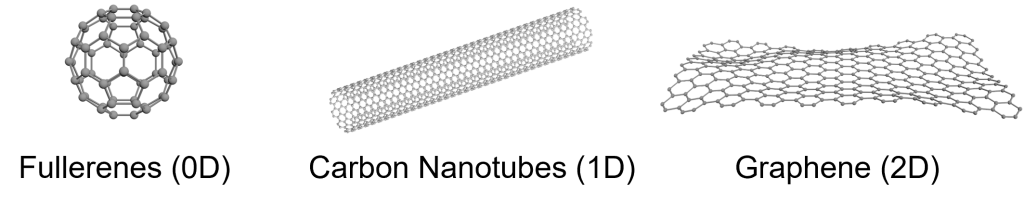 Nanomaterials are materials that have at least one dimension in the nanometre scale (10^-9 m). Low-dimensional nanomaterials are even more special — they are extremely small in only one, two or all three directions. For example, in the carbon materials family, we have well-known nanomaterials such as 0D fullerenes, 1D carbon nanotubes and 2D graphene (Figure 1).